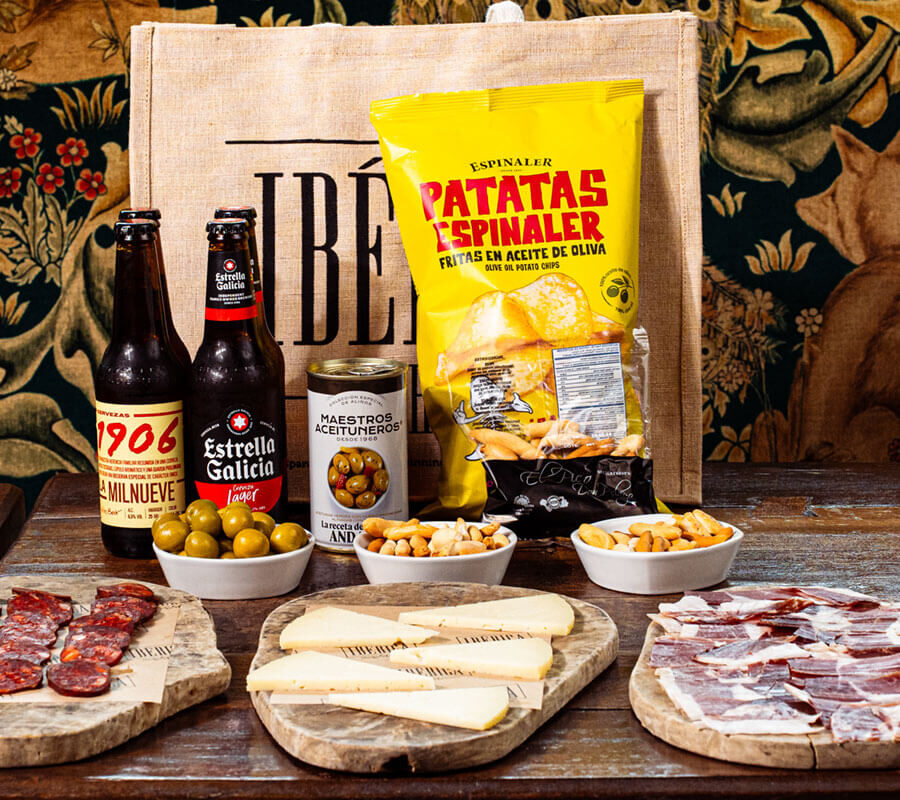 Experience the essence of Spain from the comfort of your home with our exclusive Spanish night-in hamper, crafted in partnership with Iberica Restaurants. Enjoy the refreshing taste of two of Estrella Galicia’s most popular beers: their Especial Lager, and their 1906 Reserva Especial – complemented by exquisite Jamón Ibérico, mild chorizo, Manchego cheese, artisinal picos (Spanish breadsticks), marinated olives, and the moreish crunch of Espinaler olive oil crisps. Complete with an EG bottle opener and a stylish Iberica jute bag, dive into a world of culinary exploration – order now and let the fiesta begin!